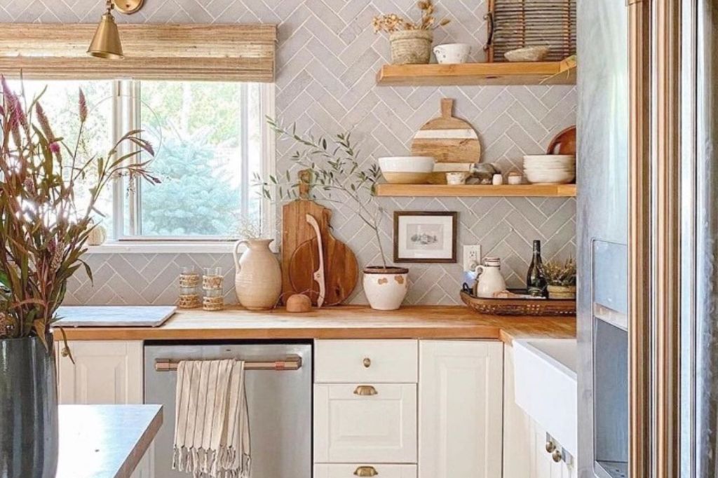 If clutter gives you a headache, that’s okay. Just mix shelves with closed cabinets; you get the style without the constant pressure to organize.