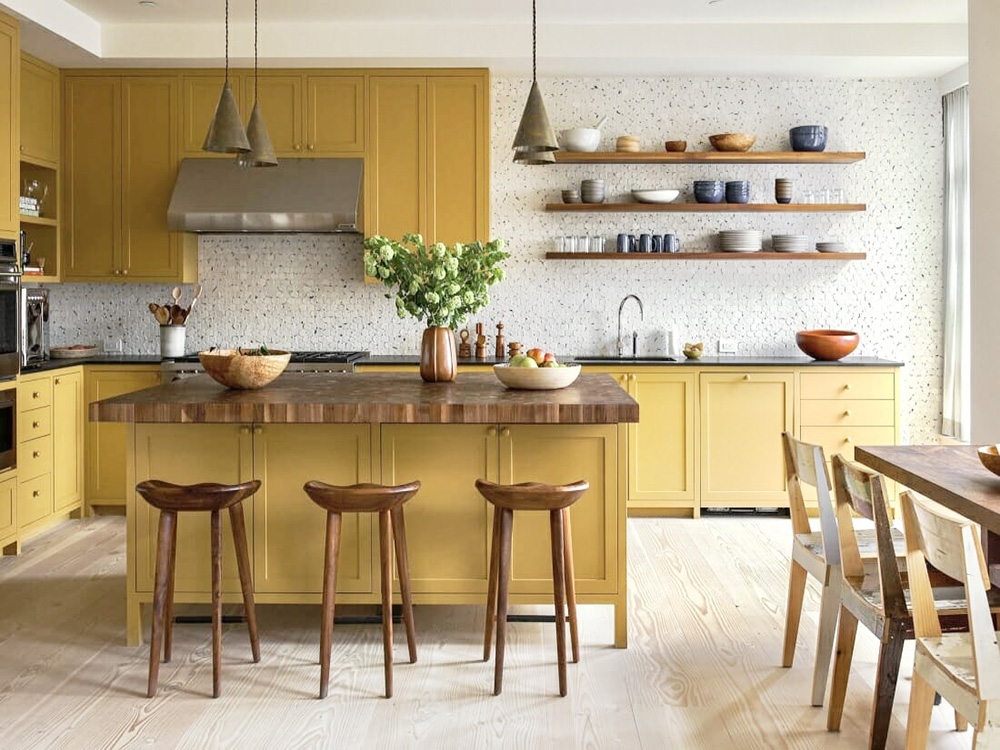 If you want to take it a notch higher, consider complementing the mustard cabinets with black iron hardware, open pipe shelving, concrete countertops, and Edison bulb pendant lights.