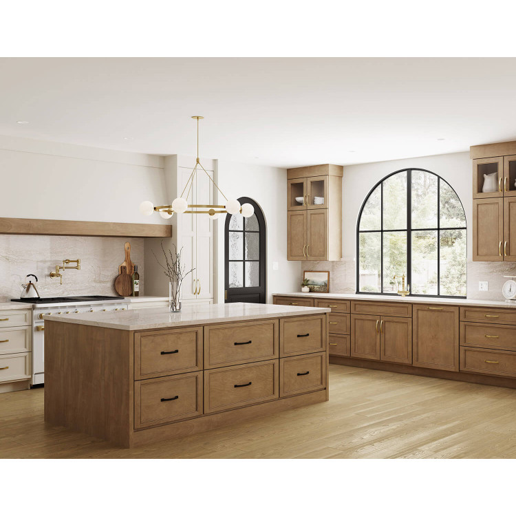 opt for natural oak, maple, or a warm walnut stain, light brown cabinets bring